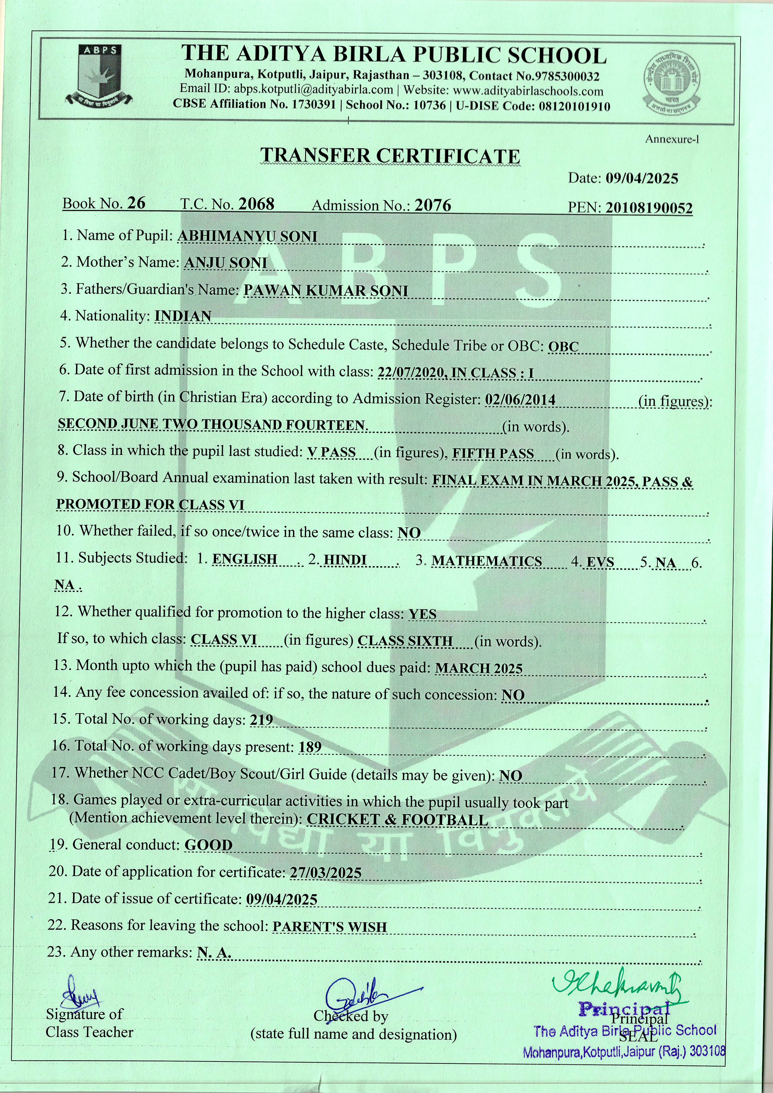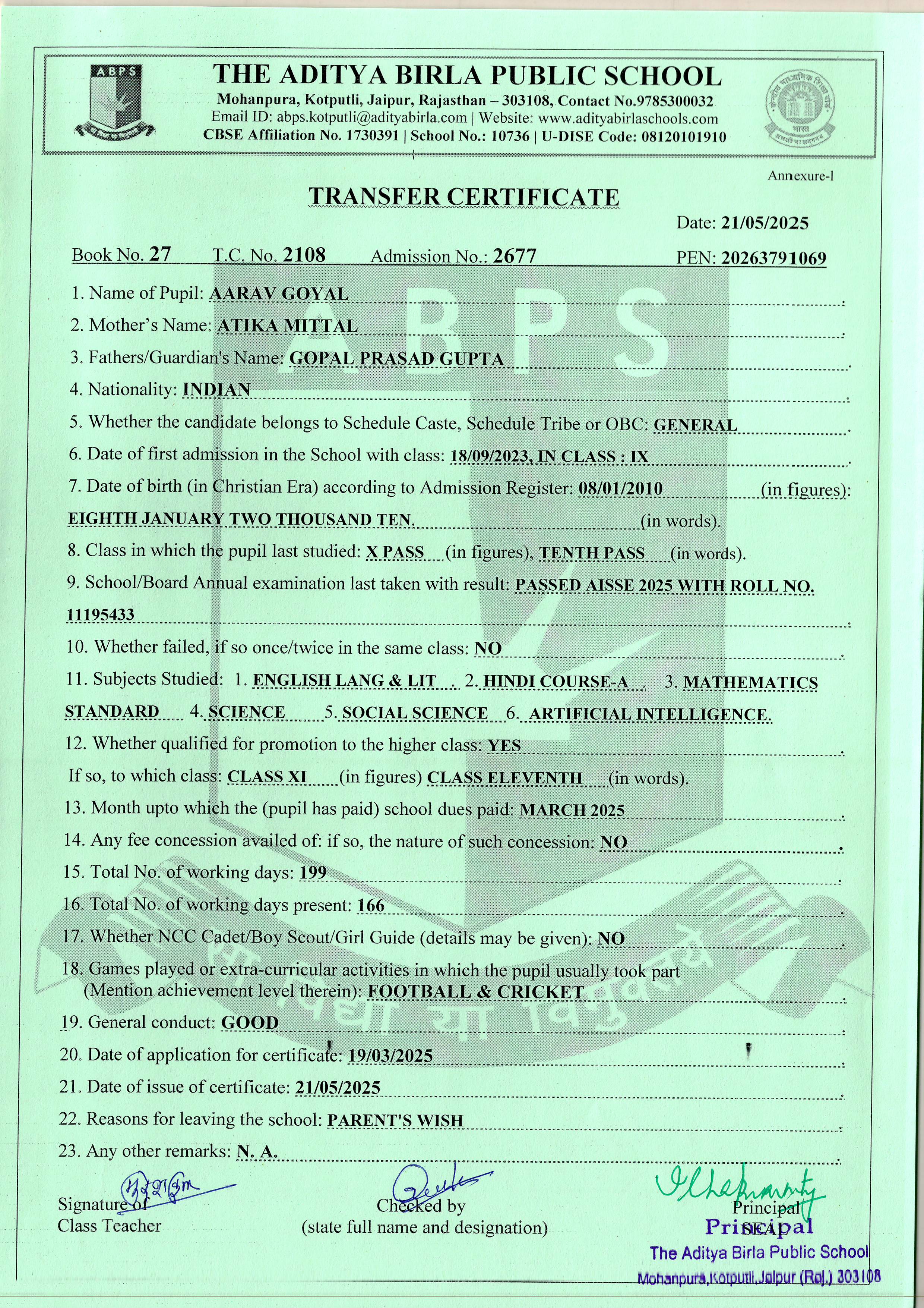 | Aarav Goyal | 10th | 08-01-2010 | Click To Show |