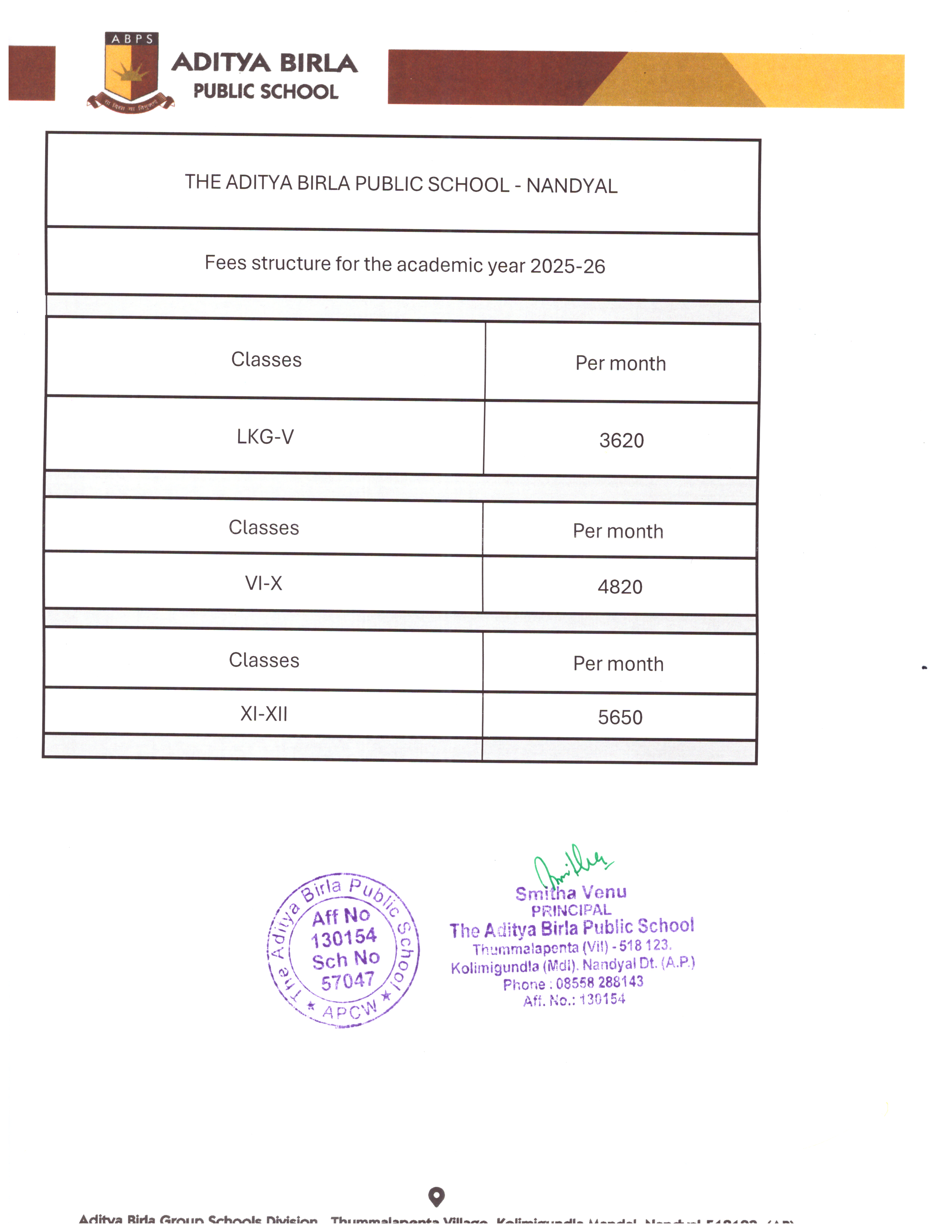 The School Management Committee (SMC) of Aditya Birla Public School, Nandyal plays a vital role in ensuring the efficient management of the school’s academic, administrative, and safety policies. It includes members from the school leadership, teachers, management officials from UltraTech Cement, and parent representatives. The SMC meets periodically to review the school’s progress and ensures compliance with CBSE and government norms.