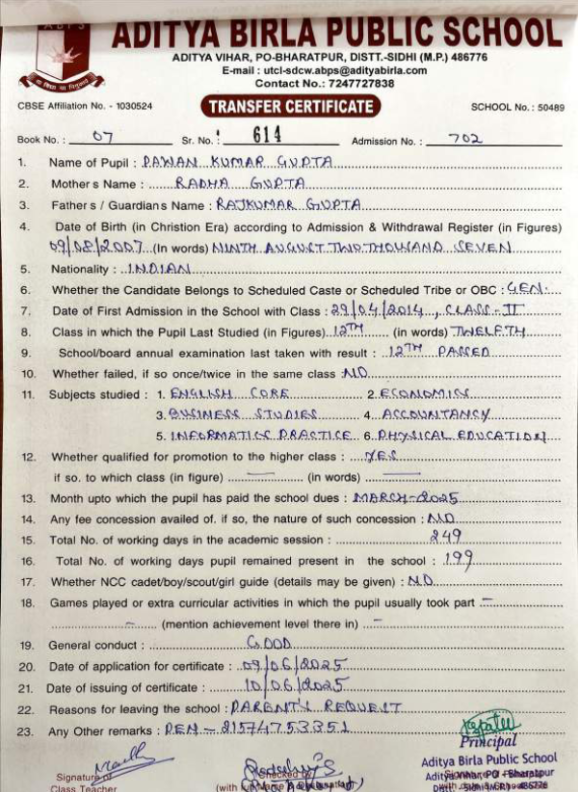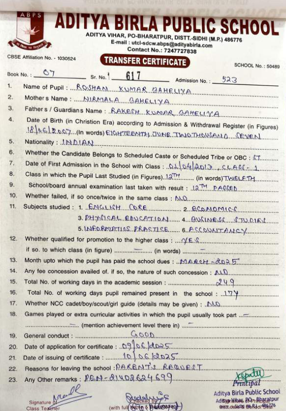 | Roshan Kumar Baheliya | 12th | 18-06-2007 | Click To Show |