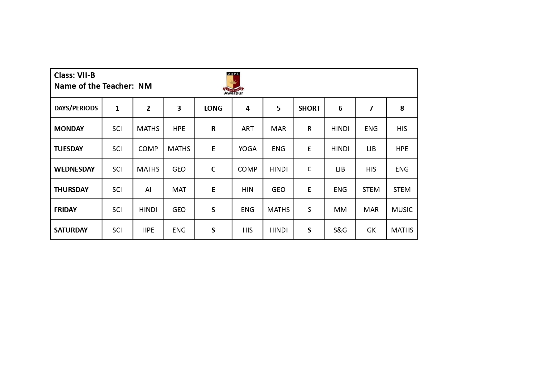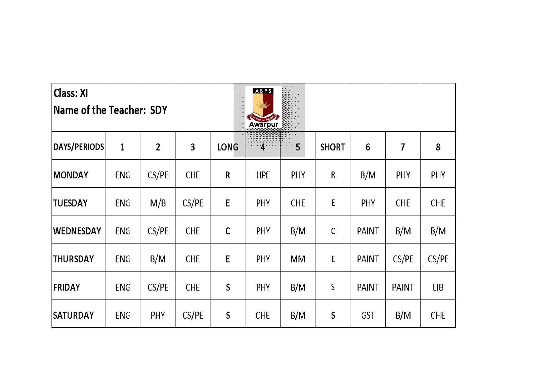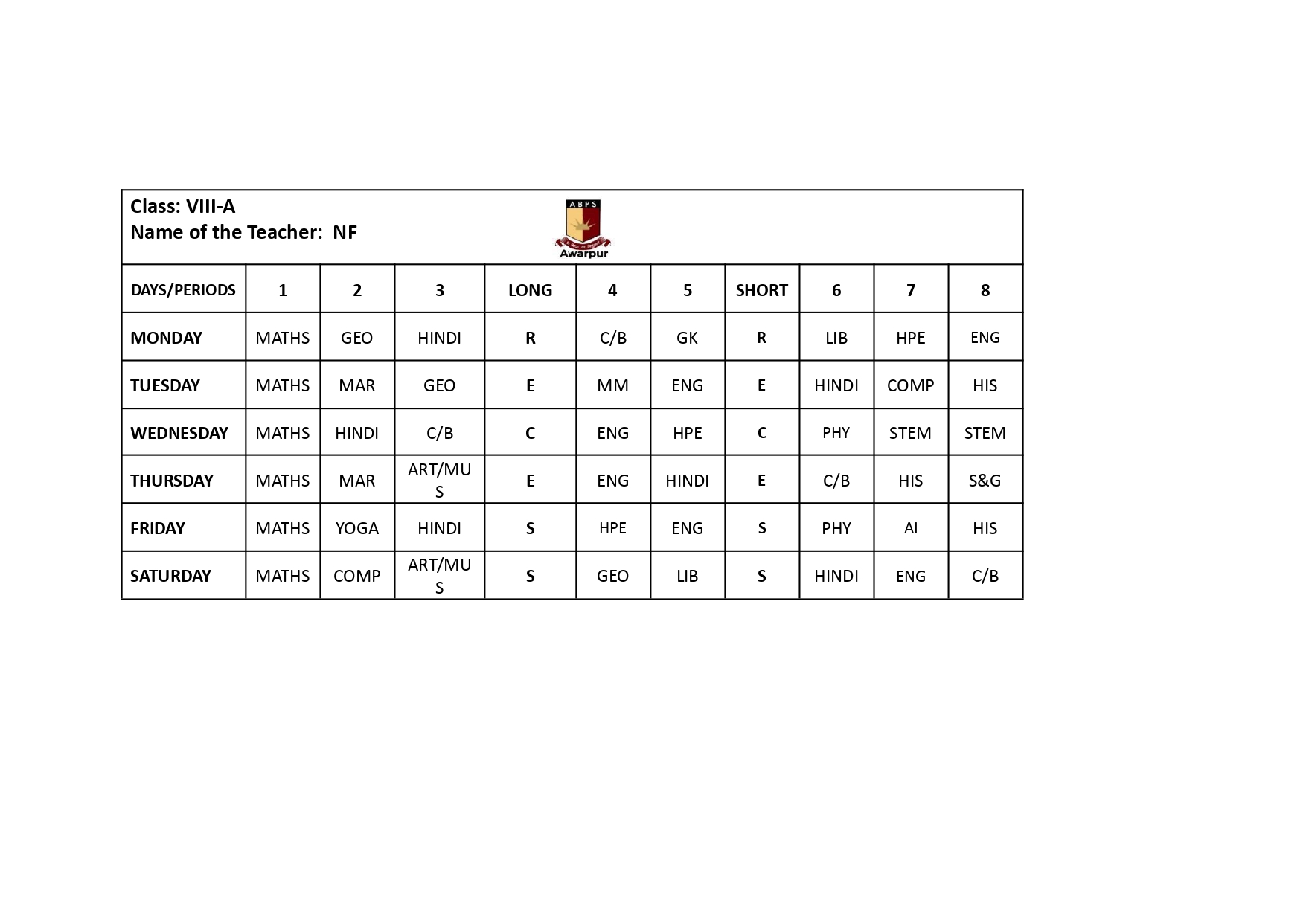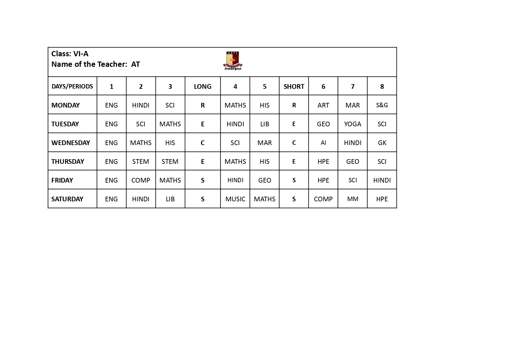 ABPS Awarpur Time Table