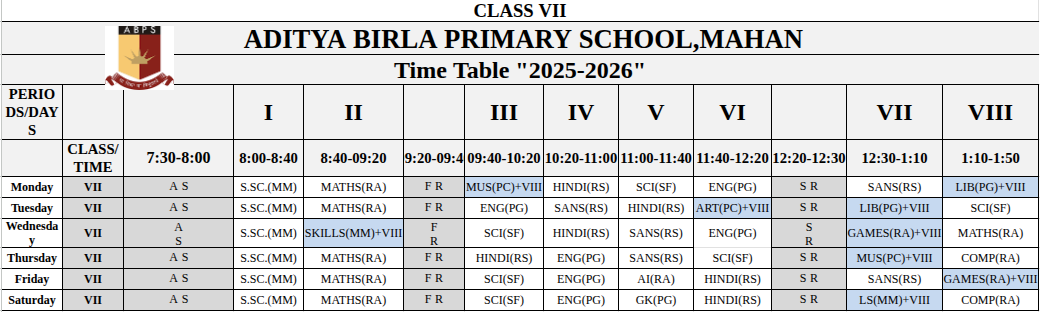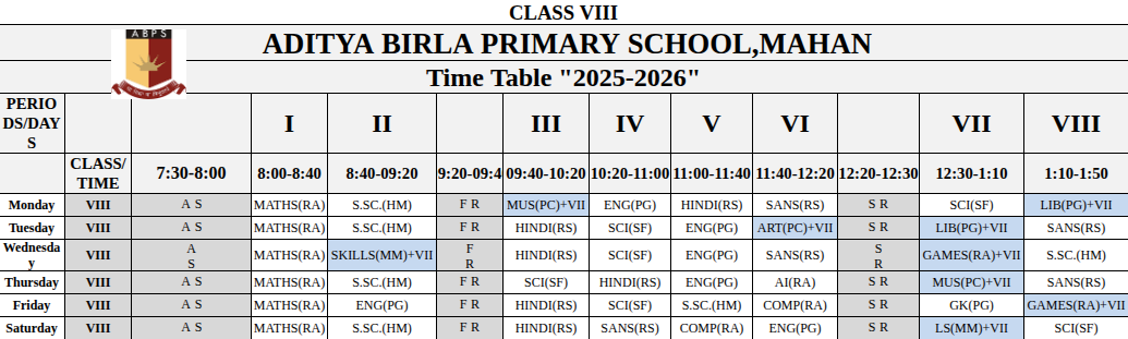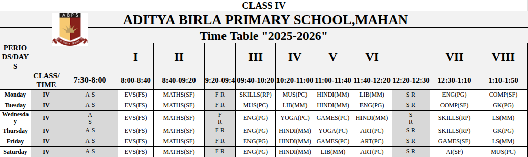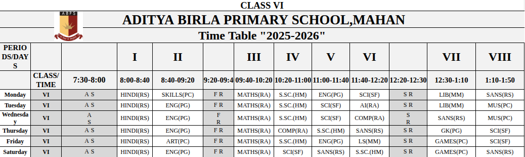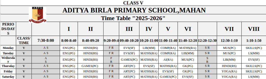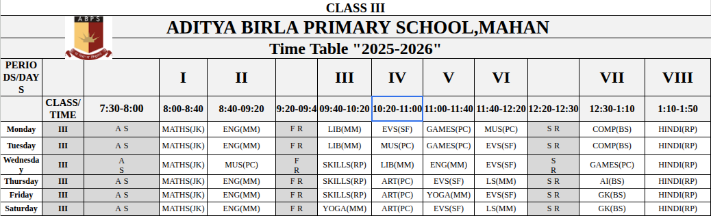 Mahan Primary School Time Table
